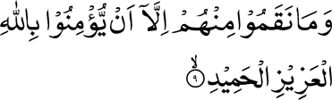 [85:9] اور وہ اُن سے پرخاش نہیں رکھتے مگر اس بنا پر کہ وہ اللہ، کامل غلبہ رکھنے والے، صاحبِ حمد پر ایمان لے آئے۔