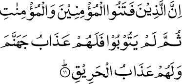 [85:11] یقیناً وہ لوگ جنہوں نے مومن مردوں اور مومن عورتوں کو فتنہ میں ڈالا پھر توبہ نہیں کی تو اُن کے لئے جہنّم کا عذاب ہے اور اُن کے لئے آگ کا عذاب (مقدر) ہے۔